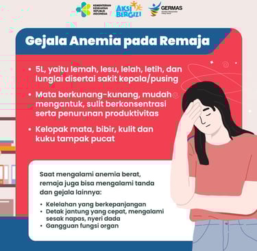 Gejala anemia pada remaja putri juga dikenal dengan istilah “Gejala 5L”, yaitu lemah, letih, lesu, lelah, dan lunglai. Gejala ini sering kali disertai dengan wajah tampak pucat, kulit dingin, dan detak jantung yang lebih cepat dari biasanya. Pada kasus yang lebih serius, anemia dapat menyebabkan kesulitan bernapas saat beraktivitas ringan. Mengenali gejala-gejala ini sedini mungkin sangat penting agar anemia bisa segera diatasi dan tidak mengganggu aktivitas maupun prestasi remaja.