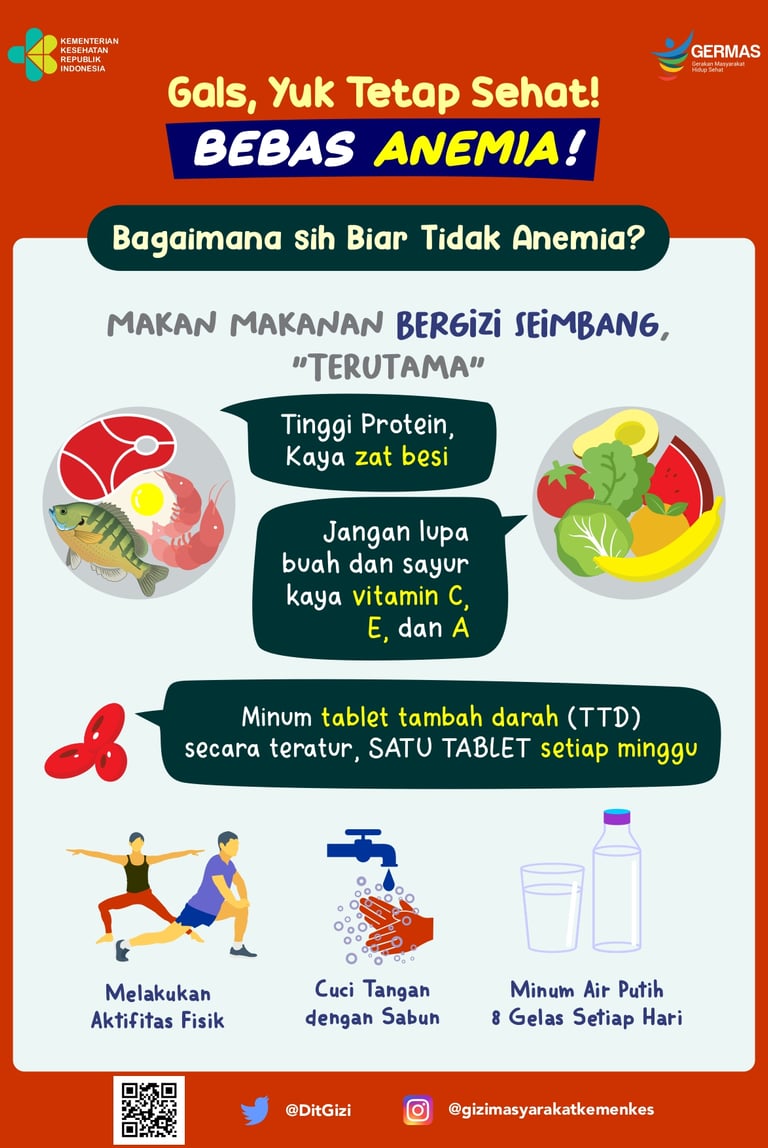 Anemia dapat dicegah dengan mengonsumsi makanan bergizi seimbang, terutama yang tinggi protein dan kaya zat besi seperti daging, ikan, telur, dan kacang-kacangan. Jangan lupakan asupan buah dan sayur yang mengandung vitamin C, E, dan A karena membantu penyerapan zat besi lebih optimal dalam tubuh. Selain itu, minumlah tablet tambah darah (TTD) secara rutin — satu tablet setiap minggu — untuk mencukupi kebutuhan zat besi, terutama bagi remaja putri yang berisiko lebih tinggi mengalami anemia.